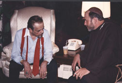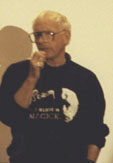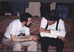 Tony: Tony looked great, and seemed to be in great spirits. He even allowed me to do a card trick for him. Throughout the event, Tony appeared in numerous costumes and guises. My favorite was when he appeared with some little monster or creature sitting on his shoulder that could nod yes or no and move most realistically. One can only guess as to his thoughts after such a tough year, but I think he was most appreciative as to the efforts everyone put into this year's convention. He knew that they were really doing it for him. The Allerton: Either we were all luckier this year, or there has been some remodeling done. Everyone I spoke to occupied a much nicer room than last year. The best new room was the hospitality suite, a large corner room on the top floor, with fireplace and sunken conversation pit, a well-staffed and stocked bar, and a sweeping view of the Chicago skyline. Now, if only bizarrists didn't smoke so much . . .