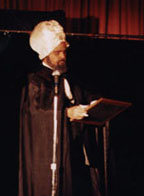 Best straight mentalism: Ross Johnson. First time I've seen Ross. He did a blindfold routine, and although it went on a bit too long (an inherent problem in any blindfold routine is that, once the spectators realize that you can see, the basic effect is over), it fooled me and played strong. He followed this with a very strong volley of readings. While some of the spectators must have been "clipboarded" for him to pull this off ("clipboarded," by the way, was the hot word this year), it played great and also fooled and surprised me. Best emcee: Stephen Minch. I've known Stephen for years, but have never seen him on stage. He did a chilling recitation of Edgar Allan Poe's "The Conqueror Worm." Terrific voice modulation here. Also very wise and witty and charming introductions of all the acts. Steve had the excellent fortune of emceeing the best set of the convention -- all perfect acts. Best impromptu stunts: (1) Earl Keyser would borrow your room key, one of those plastic plaques with coded holes in it, and then by reading the holes through a process he called "spotology" would tell you your room number. Most effective. (2) Lee Fried didn't realize that he was a scheduled performer. He went shopping at Water Tower Place for a deck of jumbo cards, and in a novelty shop stumbled upon a ball that was being sold, a red translucent rubberish ball that sort of goes splat instead of bouncing. He bought one and got several quite amusing minutes out of the thing on stage by introducing it as a dragon's eye. Very resourceful. Best gore: Joe Givan, whose entire act was just fine this year, had a great bit wherein he drove a knife directly into his wrist (the knife is vertical and perpendicular to the wrist; this isn't the knife that Ed Alonzo has used on TV and is being sold for $97.50) and then slashed it all the way up to his elbow. Comedy act awards: (1) Docc Hilford. First time I've heard of Docc, and I am completely sold. He did an absolutely manic rendition of a mad scientist who did mindreading by injecting a new enzyme, which happened to float in a jar of blood, directly into his brain. There would supposedly be no after effects, but, well, you've all seen all those old horror movies. (2) Lee Earle. Lee did a great takeoff on Ross Johnson's blindfold routine by trying to guess which of several glasses held apple juice and which contained a substance that "looks like apple juice." He obtained the latter by inviting Richard Webster on stage and then filling the first three glasses with the juice. He then handed Richard the empty glass and told him to fill the final glass with you know what. Looking sort of sheepish, Richard started to leave the stage to comply. "No, no," Lee stopped him. "If you leave the stage, they'll know you switched it." Etc., etc. Lots of great bits here. [I would later learn that this effect is called "Urine Luck."] (3) Madam LaZonka, an old gypsy woman from distressed Lithuania (who sounded suspiciously like Brian Flora). Two-person code act with Brian's wife: The wife holds up an object, LaZonka shouts out what it is in Lithuanian, and the wife interprets, correctly of course. Then, switching to English, LaZonka starts doing cold readings from the stage: "I see great pain . . . a baby . . . suffering . . . death in the family . . ." The older lady sitting next to me starts wailing inconsolably, tossing tissues into the air, etc. (4) Kardor [Robin DeWitt]. As great as last year. Following Ian and Hillary Flora, Kardor strode dramatically onto the stage, turned and glared menacingly at the audience, and said with disgust, "Kardor has to follow cute children." At one point, having tossed some object over his shoulder to get a random spectator on stage, he wound up getting Ian, which he also turned into great laughs. (5) Bruce Bernstein. A straight mentalist, Bruce opened with a great laugh by encouraging the entire audience to join him in an imitation of Eugene Burger. Very funny and it worked, but this took balls.