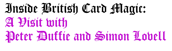 Interviews are more fun when conducted face to face, especially if the other face belongs to, say, an Erika Larsen. The following interviews were conducted electronically. While they lack the immediacy of a face to face session, they offer the redeeming grace of getting the subjects' answers exactly right, for the record. The prior method, however enjoyable, relies too heavily on the increasingly faulty memory of this scribe. I am deeply indebted here to my subjects, Peter Duffie and Simon Lovell, for sharing both their time and their private thoughts with us. I thank them profusely.
