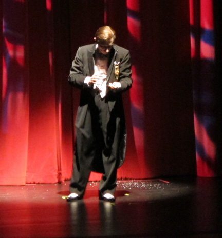 Oh, there was plenty more between the morning General Sessions (for my group) and the afternoon Focus Sessions. Comedy delivered -- A surprising number of session talks were hilarious. Mark Kornhouser, MAGIC's sharpest contributor lately, punctuated his talk on high concepts with some pyro-flatulence and a talking dog that cracked everyone up. "What the hell is she doing?" the dog asked of the lady signing for the deaf. Voronin, who recently completed another Teatro ZinZanni stint with Joan Baez, opened a show with his dancing ears. ![]() Voronin commands the stage. Michael Weber emceed and delivered an Update with biting observational humor. Derek Hughes killed with refreshingly original lines. "How do you get into magic? Suck at sports. That's how we get into magic." He had a wonderfully politically incorrect word for a female magician that I can't print. But my favorite was Master Payne, whose Publish or Perish slide show on achieving immortality through contributing to magic magazines had us "PNP" (peeing in pants). The funniest slide was of the tearful widow carting her husband's magazines away for disposition. What a smile. Mysteries solved -- An equally delightful number of talks taught some great magic. Sos and Victoria revealed quick change methods, something I had no knowledge of. Johnny Thompson provided a generous pot pourri of material. Ian Rowland contributed entertaining mentalism routines (to some an oxymoron!). Daryl focused on a generic concept that made many tricks possible, of which I greatly enjoyed his take on "The Professor's Nightmare." Gregory Wilson and David Gripenwaldt taught enough practical routines with coffee cups to make you the hit of your local Starbucks. Michael Ammar hosted a session in which John Lovick taught the best bill switch from his mammoth Switch book, Jason England taught a couple of useful palms, and Richard Sanders fried us with uses for repositional Glue Sticks. I look forward to trying Michael's own routine for a torn and restore card. ![]() Armando Lucero tips precious secrets. All nice, but the ace in this deck was Armando Lucero's method for transporting a coin from one card to another, by real magic. Armando teaches his full blown "Coin Menagerie" routine for thousands of dollars, hence it was special that he taught this much of his thinking for free. The attention to detail, the critical thinking involved, and the evolution of the routine are all just stunning. Place this routine among my Fab Five above; it belongs there. Highbrow moments -- Historically, some MAGIC Live! lectures are purely educational, and this edition had its share. The always popular Levent spoke on the value of learning from the old books, with Linking Rings demonstrations to illustrate. Chris Kenner spoke on "How to Shoot Yourself" (with a video camera) by drawing on the videos he has captured over the years of "Three Fly." Chris sucked me in with a video of his wife, Katie, performing difficult sleights such as one-hand shuffles, only to reveal that someone was lying on the kitchen counter behind Katie and doing the real work. Long the pied piper of youth in magic, Chris closed with an admonition not to blame today's youth for playing the cards they've been dealt. Johnny Ace Palmer gave a laid back talk on table hopping, performed some of his classic routines, and dropped the tidbit that his uncle considered buying the Magic Castle (the entire hill) when it was for sale. ![]() The invisible man starts unwrapping. Paul Kieve presented a fascinating talk on magic in the legitimate theater, the best part being his own contributions, beginning with a very deceptive production of "The Invisible Man." Removing the bandages from the actor's head looked just as it did in the movie, but it wasn't a movie. And then there was Mark Setteducati on Creativity. Arguably the best at what he does, arguably the only one, Mark discussed such elements as invention, styling, and details as they applied to the many puzzles, games, books, Christmas cards, and magic tricks he has invented and marketed over the years. At the conclusion my seating companion said, "This is the best, the most content rich talk of the convention." OK, this too belongs in that Fab Five. Make it the Magnificent Seven. The good, the bad, and the ugly -- Lest you think I am some sort of Stan Allen shill, I must report that not everything was perfect. Given that I was coming off a recent surprising haircut, I wasn't anticipating seeing my mug on a MAGIC Live! cover photo badge. Nevertheless, the delay in getting badges that some of us suffered was annoying and eventually became the target of one of Michael Weber's Update jokes. Seating this year, in order to accommodate more attendees, was in the Orleans showroom, which created several drawbacks. First, as every session had to be repeated, the seating ruled out possible singular events, such as a Jason Alexander interview. Second, as someone else pointed out, the great divide meant that you kept not running into friends that you enjoyed seeing, because they were elsewhere. Third, despite good sight lines, seating was kind of tight, making it harder to walk out if you needed to use the restroom, to flee a boring speaker, or just to stand off to the side to take a photograph. (I took the printed advice and queued up early enough to sit in the back on an aisle, but still ...) In general, I greatly prefer the large lecture halls that served the first four Lives! Finally, not every speaker was my cup of tea. With apologies to friends who are in this line of business, I have little stomach for motivational speakers. We endured three. I submit that MAGIC Live! attendees are Magicians of Above Average Intelligence, not salesmen in a development seminar. Just talk to us; no cheer leading or contrived relationship building is necessary. Shopping cart -- The dealers seemed pleased and numerous items sold out. I gravitate towards H&R Magic Books as the focus of any conve