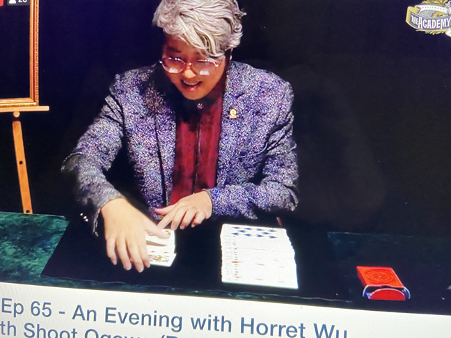 RETURN TO BEHIND THE BOOKCASE – I was badly fooled Sunday 12/13 by Horret Wu. His jumbo card routine, in which jumbo cards dealt to the table assumed normal proportions, looked like trick photography. An appreciative Shoot Ogawa hosted.