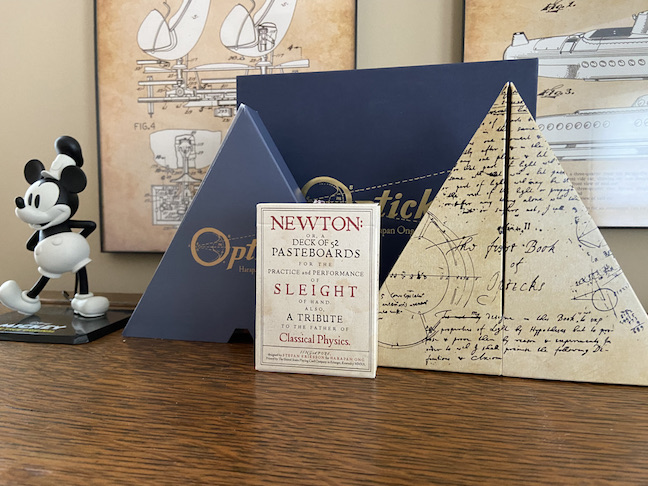 Principia, reviewed here in January 2019, was an unusually handsome hardback book encompassing a wide range of card magic (spread over 74 titled items, tricks and essays). Opticks is primarily a download of 26 strong card tricks, accompanied by an elaborately packaged deck of cards featuring Newton-inspired art. Both Principia and Opticks also come with a packet of necessary gaffed cards. The Newton deck, which includes a few of its own gaffed cards, comes packaged inside a triangular box inside a triangular sheath inside a rectangular box in a slipcase. Strange!