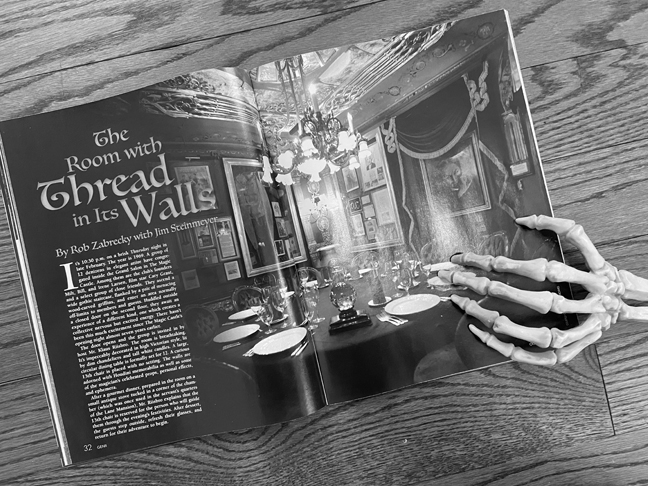 Genii has long celebrated séances at the Magic Castle. Subscribers are encouraged to revisit the issue of January 2003, which devoted 6 pages to the Castle’s 40th anniversary and 28 pages to its spooky nature. The latter included “Haunted Mansion” (11 pages on spooky gags and goings on, such as the Robert LaPlaine/Jim McKee “bare bones” displays used here in the title images), “Bumps in the Night” (a 5-page scare by scare report on a séance my friends and I attended), “Dark Secrets” (4 pages behind the scenes with James Williams), “Leo Kostka House Medium” (a 5 -page interview with Leo), and “Have Ghosts Will Travel" (3 pages on Leo’s clever séance you can do in the homes of others, plus a great full apparition). A nice companion to the current issue for getting into the Halloween mood. |
