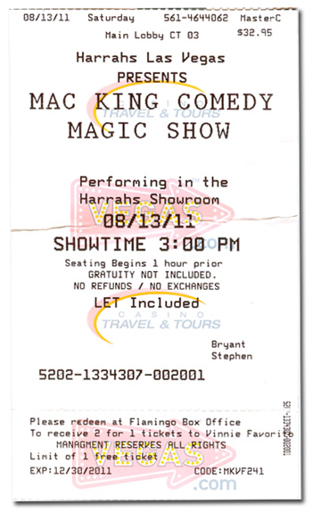 MATINEE IDOL -- The week preceding MAGIC Live! had been a week of portent: a low-grade fever, a surprising haircut, a plummeting stock market. Could it be that Stan Allen's fifth MAGIC Live! might not stack up to its predecessors, not because of Stan and his crew but because my own personal stars seemed out of alignment? ![]() Best deal in Las Vegas. Just in case, I arrived in Las Vegas with barely an hour to scurry over to the Mac King Comedy Magic Show. It was like insurance at blackjack; no matter what happened during the rest of the week, my trip to Las Vegas would rate as a good time. The show was predictably excellent. If you congratulate Mac on a great show, he'll shrug it off as "the same old crap." This is like Jay Marshall or Ballantine saying that they did "the same old crap." This is classic comedy magic for the ages. Plaid rocks. |