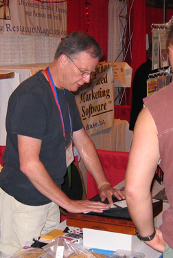 IBM/SAM CONTESTS -- With $10,000 and a pile of contracts available to the winners, we expected and saw great contestants. Judges narrowed the field to six finalists in close-up and stage categories, and the audience made the final selections. Two acts I enjoyed that didn't make the final six include John Born's close-up set and the Reed Sisters' new stage act (Jessica still does her bare-hand dove to rabbit, Shayna still does her mind-blowing interlocked card production, and they all dress up really great). Among the finalists, I greatly enjoyed Mark Oberon's winning Midas touch act, but voted for Latko, who exhibits a charming personality as he produces an entire chess set from what begins as a Cups and Balls routine. On stage, I especially enjoyed Tony Chapek's interactive television act and David Kaplan's comedy act, but succumbed as did a majority to the exciting card productions of An Ha Lim of Korea. The bottom line: the 20 grand went to the right people. IBM/SAM AFTER HOURS -- The best part of any convention is the after-hours socializing, and so it was with this one. It was cool for me to meet longtime idols Voronin and Philip Morris. It was great for me to spend an hour catching up with my old friend Simon Lovell, including hearing all the juicy secrets of Celebracadabra. Mark Horowitz shared a look at some of his great magic comics collection. Youngsters Matt Richman (13) and Jordan Cotler (14) performed extraordinary card moves. Youngster-at-heart Jon Racherbaumer killed with a squeaky clean "Twisting the Aces," a Howie Schwartzman effect from MUM, and a version of "Triumph" that caused one viewer to exclaim, "That was even better than Joshua Jay's!" The most surreal moment came when Mike Powers and I were invited upstairs to be interviewed on a live internet video feed, courtesy of the guys at StreetofCards.com. This was at two in the morning, and it amazed us that there were folks actually watching this stuff, folks we knew, texting us questions. Many others were interviewed through the week; check out the site. |