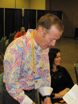 INFORMALITIES -- The only disappointing thing about this magnificent hotel was that it didn't offer a natural focal point for after-hours congregating, as the Galt did last year with its suspended bar and 24-hour service. Nevertheless, moments arose. It was fun to meet all the nice magicians from Tennessee. It was fun to see Kozmo doing Matrix for the youngsters. (By the way, I subscribed to his reel magic DVD-zine this trip; you should too!) San Diego's Bob Ingalls has either become psychic in his old age or has purchased a very cool dice trick; he always knew which way a die was facing. It was great to catch up with Jason Latimer on his current and near-future plans: very exciting stuff. And the Strolling Olympics brought me face to face with the tag team duo of teen contestants Shin Lim and Micah Johnson; a great idea, guys, and well done! (By the way, I quite enjoyed Micah's close-up contest act.) | ![]() Mark Horowitz collects autograph seekers. |